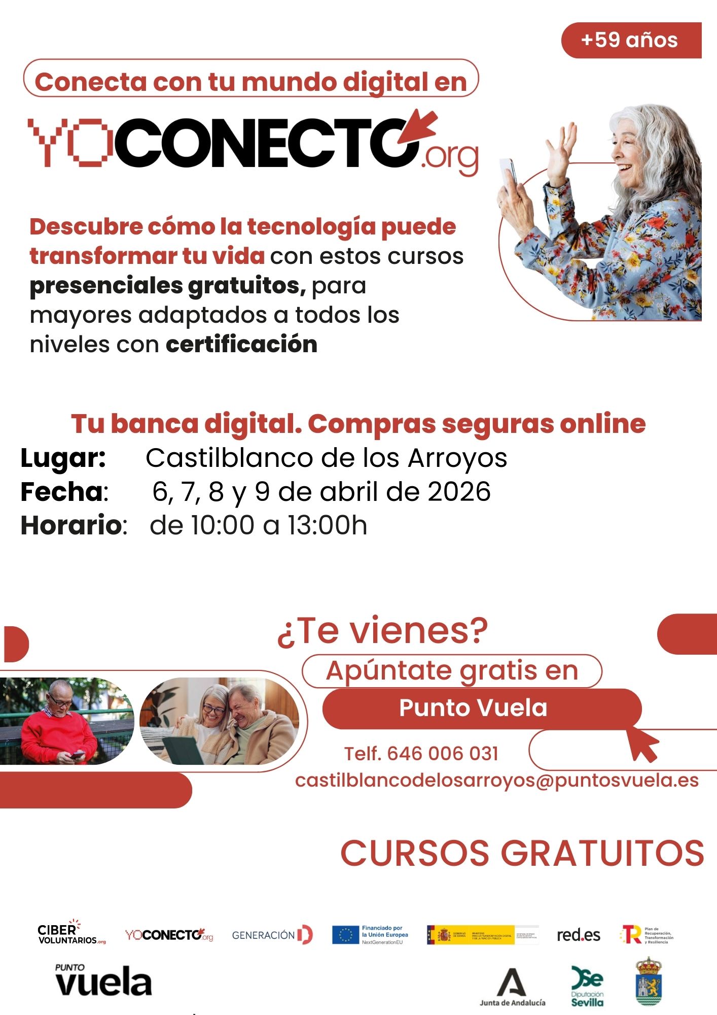 A través del programa "Yo Conecto", el Ayuntamiento ofrece talleres presenciales en el Punto Vuela destinados a mayores de 59 años y a jóvenes a partir de los 18 años, con el objetivo de reducir la brecha digital y fomentar el uso de nuevas tecnologías.