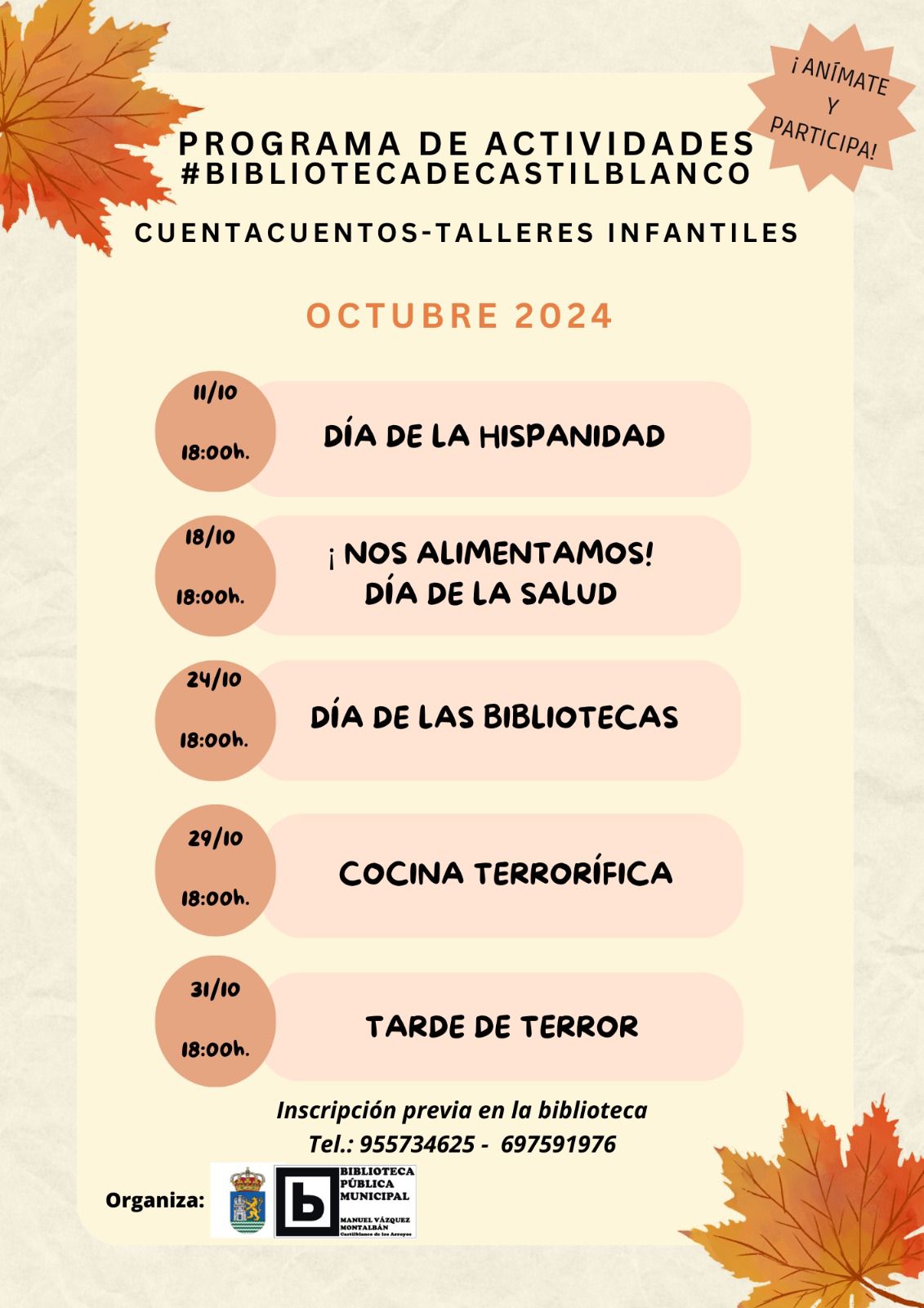 Con todas las plazas ocupadas, os recordamos el resto de talleres infantiles que la Biblioteca Municipal acogerá en este mes de octubre: