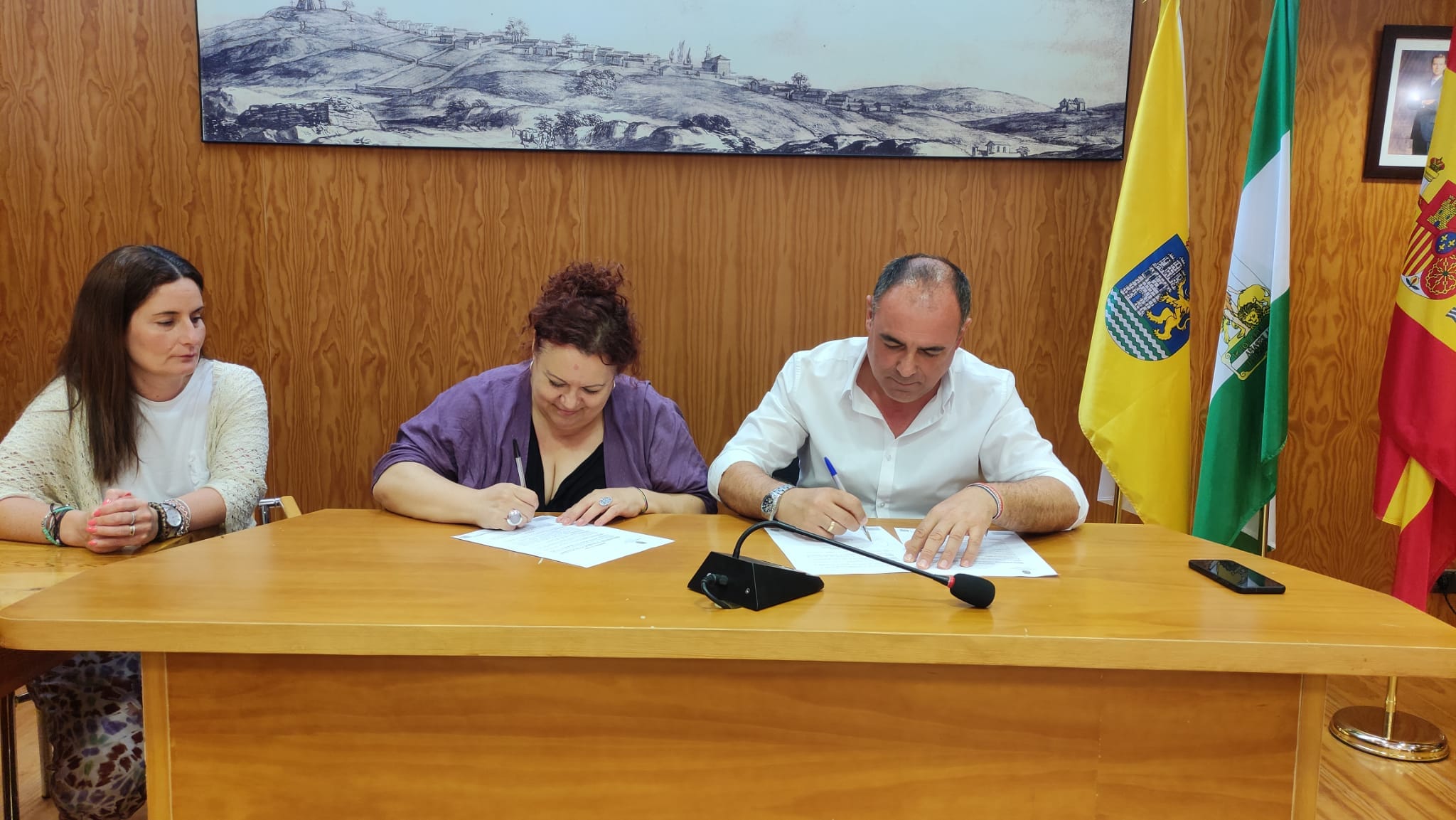 Con la firma de este documento, al que se ha dotado de una partida presupuestaria de 14.000 euros, el Ayuntamiento adjudica a este Centro el reparto del boletín de noticias para lo que se contratarán a personas con discapacidad.