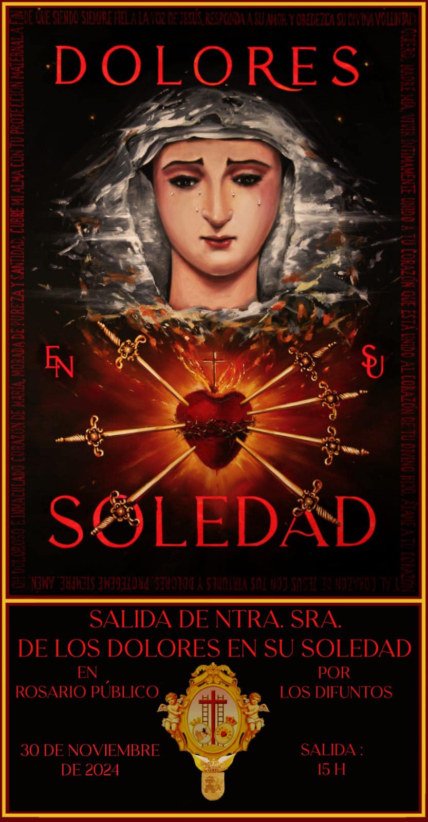 Cumpliendo con sus reglas, este sábado, 30 de diciembre, la Virgen de los Dolores saldrá en Rosario público por los difuntos, realizando un recorrido por las calles de nuestro pueblo.