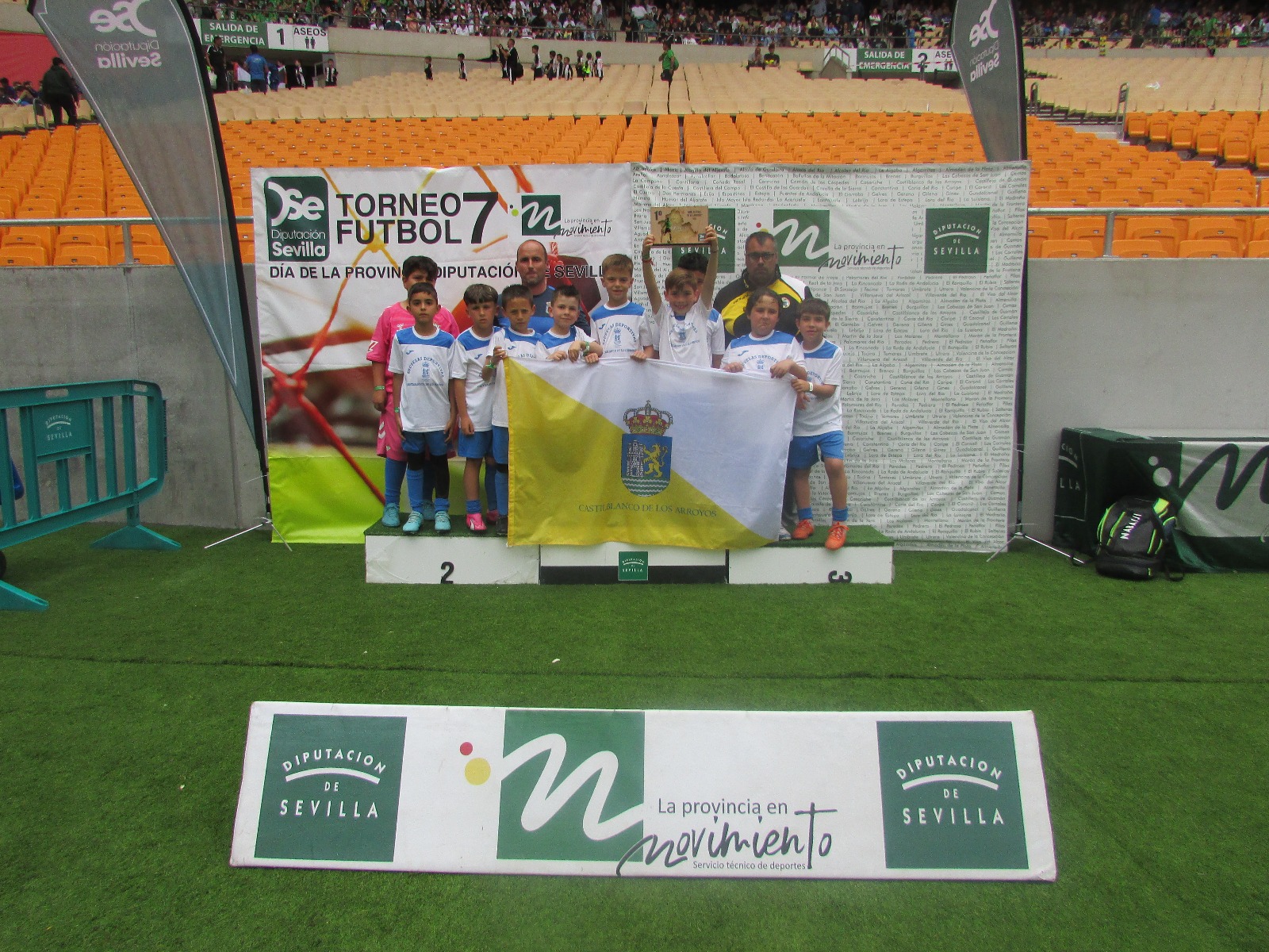 Volvemos a felicitar esta semana a nuestros equipos Prebenjamín y Alevín, pertenecientes a nuestra Escuela Municipal de Fútbol 7 por su participación el pasado sábado en el XXII Torneo de la Provincia de Sevilla que, un año más, concentró a los cuatro mejores equipos de las cuatro zonas en las que se divide la provincia en un escenario muy especial: el Estadio Olímpico de Sevilla.