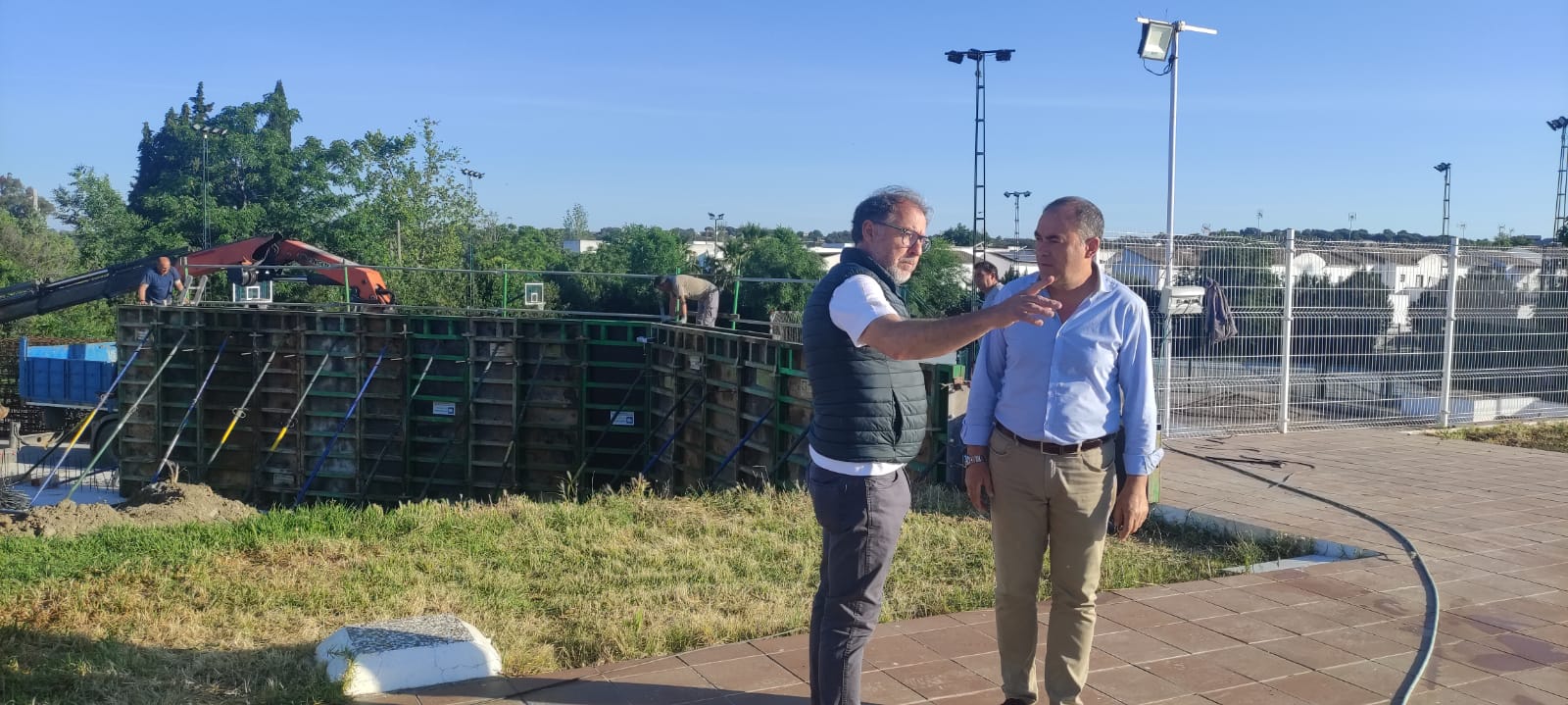El Alcalde, acompañado por el Concejal de Obras y Servicios, Fernando López, y el Arquitecto Municipal, José Ponce, ha visitado las instalaciones de la Piscina Municipal para conocer de primera mano el avance de las obras que se están ejecutando y que supondrán una importante transformación del recinto, marcando un antes y un después en su imagen, uso y funcionalidad.