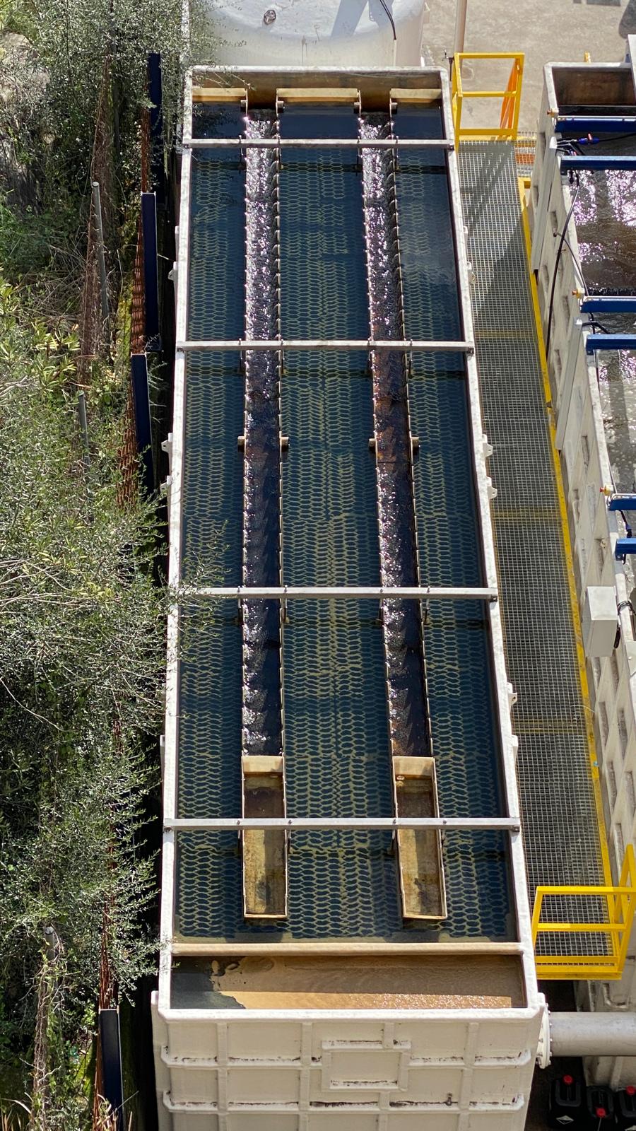 Una de las fases más importantes. La nueva decantadora ha triplicado sus dimensiones, pasando de tener una capacidad de 1.200.000 litros de agua al día, a 4.500.000 litros. En esta fase el agua entra en reposo durante dos horas para que los sedimentos más pesados (partículas, restos de barro...) pasen al fondo del depósito. Gracias a las nuevas dimensiones, se ha conseguido aumentar el tiempo del proceso, lo que mejora la calidad del agua. Al ser ahora una planta automatizada, durante la decantación, cada 12 minutos se abren unas válvulas para extraer el sedimento, lo que también influye en la pureza del agua (transparencia).