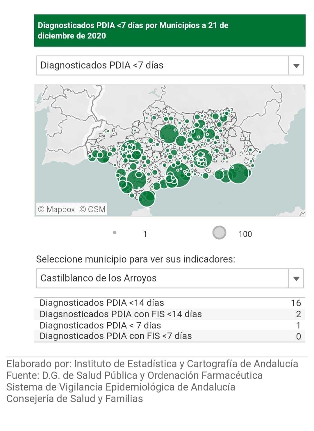 Según los datos publicados en el día de hoy por la Junta de Andalucía, Castilblanco registra en estos momentos un total de 16 casos detectados en los últimos 14 días, tres menos con respecto al pasado viernes. Aun así, cabe destacar, cómo en las últimas semanas, la curva de contagios a nivel local ha subido considerablemente, situándose la cifra de contagios en 328 casos por cada 100.000 habitantes, muy por encima de la que registra la provincia de Sevilla con 89 y Andalucía con 137.