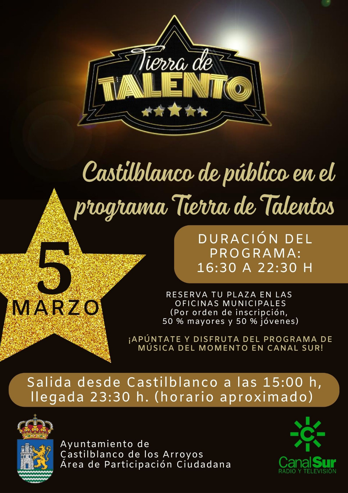 La Concejalía de Cultura y Fiestas se encuentra organizando un viaje para asistir como público a la grabación del programa de Canal Sur TV, Tierra de Talento.