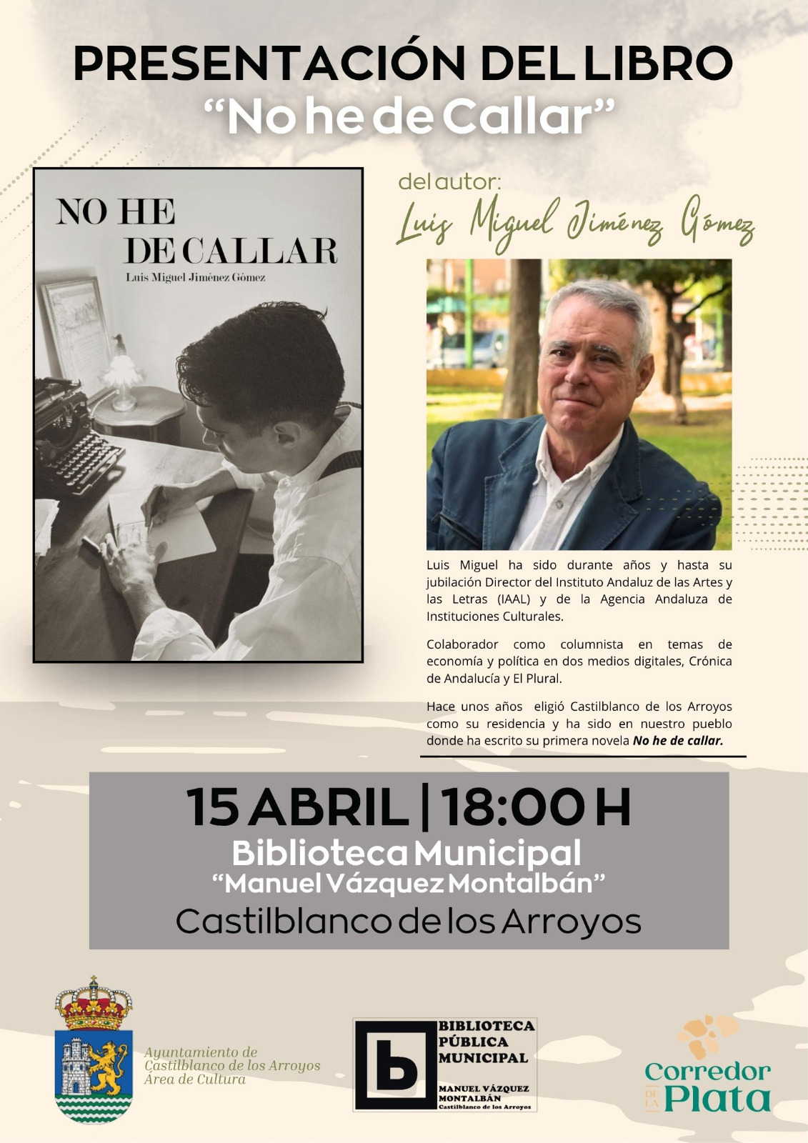 Abril es el mes de la lectura en Castilblanco y, como parte de la programación cultural de la Biblioteca Municipal Manuel Vázquez Montalbán, la Concejalía de Cultura ha organizado la presentación del libro “No he de callar”, del autor y vecino del pueblo, Luis Miguel Jiménez Gómez.