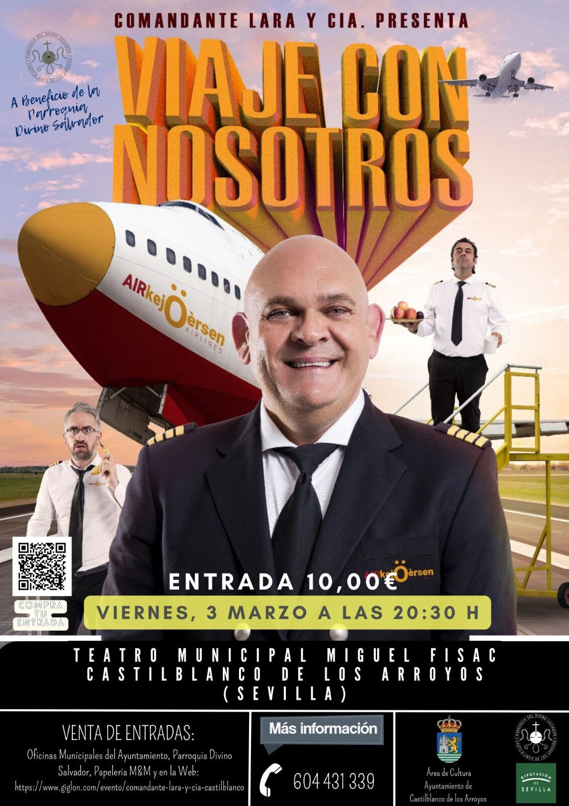 Viaje con Nosotros será el espectáculo del que podrán disfrutar nuestros vecinos y vecinas, quienes sentados en sus asientos del patio de butacas del Teatro Municipal recibirán las instrucciones de seguridad para emprender un particular viaje al país de las carcajadas. Y es que el Comandante Lara será el encargado de pilotar esta aventura, acompañado de su personal de cabina (Vicente Ruidos y Jesús Tapia).