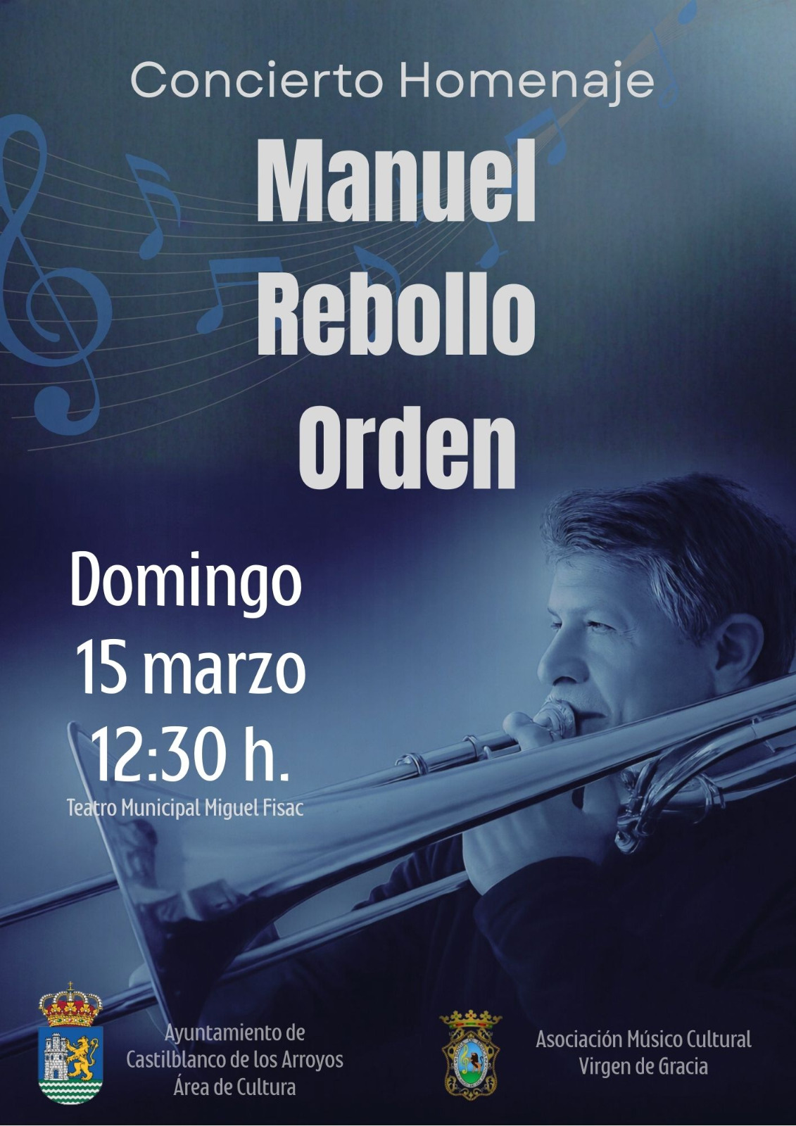 El Teatro Municipal acogerá este domingo, a las 12:30 horas, el Concierto Homenaje a Manuel Rebollo Orden, con la participación de la Asociación Músico Cultural Virgen de Gracia.