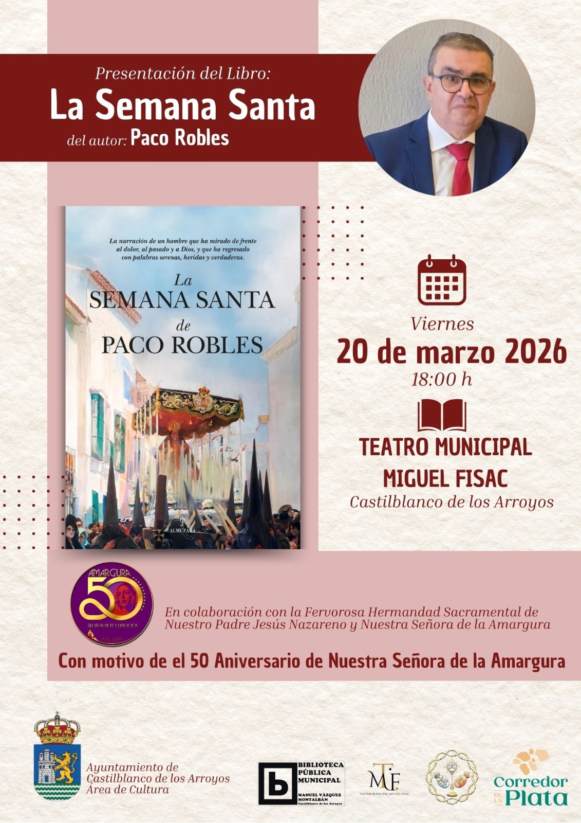 La presentación se celebra en colaboración con la Fervorosa Hermandad Sacramental de Nuestro Padre Jesús Nazareno y Nuestra Señora de la Amargura, en el marco de los actos conmemorativos del 50 Aniversario de la llegada de la imagen de Nuestra Señora de la Amargura al municipio, una efeméride que está marcando la Cuaresma 2026.