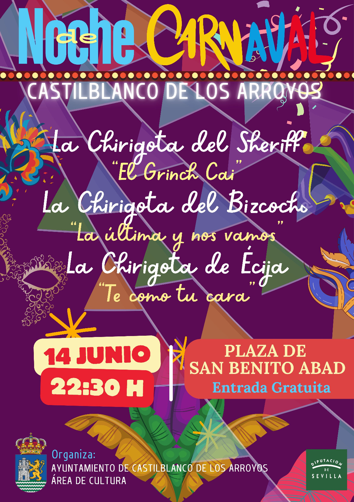 Tras el anuncio de la pasada semana, os recordamos que la Concejalía de Fiestas ha cerrado por segundo año consecutivo lo que será otra gran Noche de Carnaval, en la que este año contaremos con el espectáculo de las CHIRIGOTA DEL SHERIFF, El Grinch de Cádiz, LA CHIRIGOTA DEL BIZCOCHO, La última y nos vamos, y LA CHIRIGOTA DE ÉCIJA, Te como tu cara.