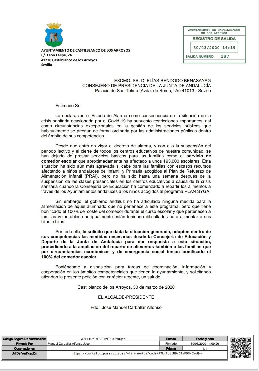 Se trata de una petición que el Ayuntamiento formuló a la Junta de Andalucía en el mes de marzo, ante el cierre de los colegios y sus comedores escolares, a través de la que el Alcalde solicitaba la inclusión en este servicio de aquellos alumnos no pertenecientes a este programa pero que, sin embargado, durante el curso tenían bonificado al 100% el servicio de comedor, debido a sus condiciones familiares.