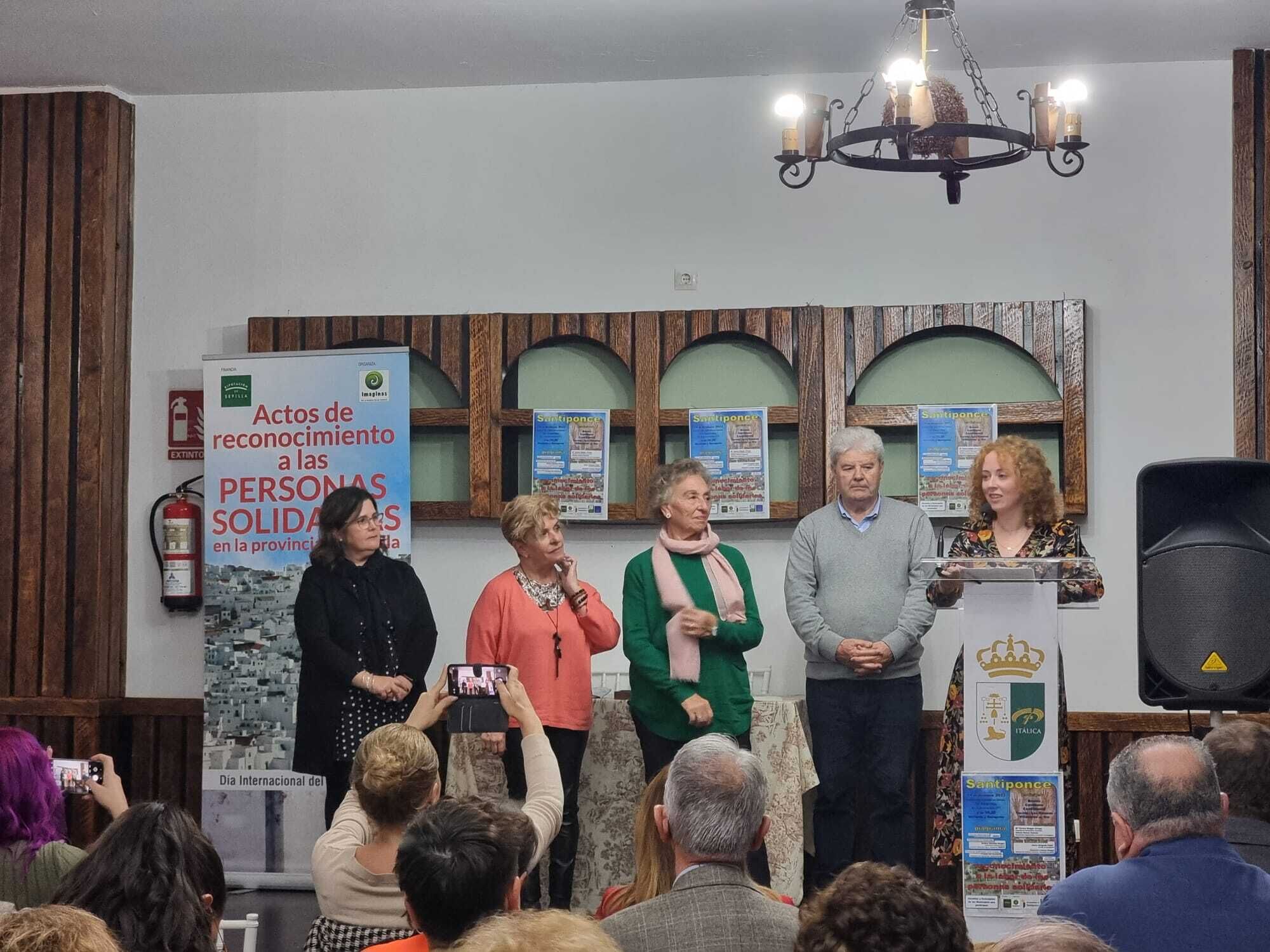Un reconocimiento en forma de placa que en la tarde de este miércoles, nuestras vecinas Isabel García y Mª Carmen Rubio, integrantes de la Junta Directiva de la Asociación, han recibido de la mano de la Concejala Laura Romero, en Santiponce, en un acto organizado por IMAGINAS, la Fundación TAS, la Diputación Provincial de Sevilla y los Ayuntamientos de Castilblanco, Brenes, Cantillana, Tocina-Los Rosales y Villaverde, con motivo del Día de las Personas Solidarias.