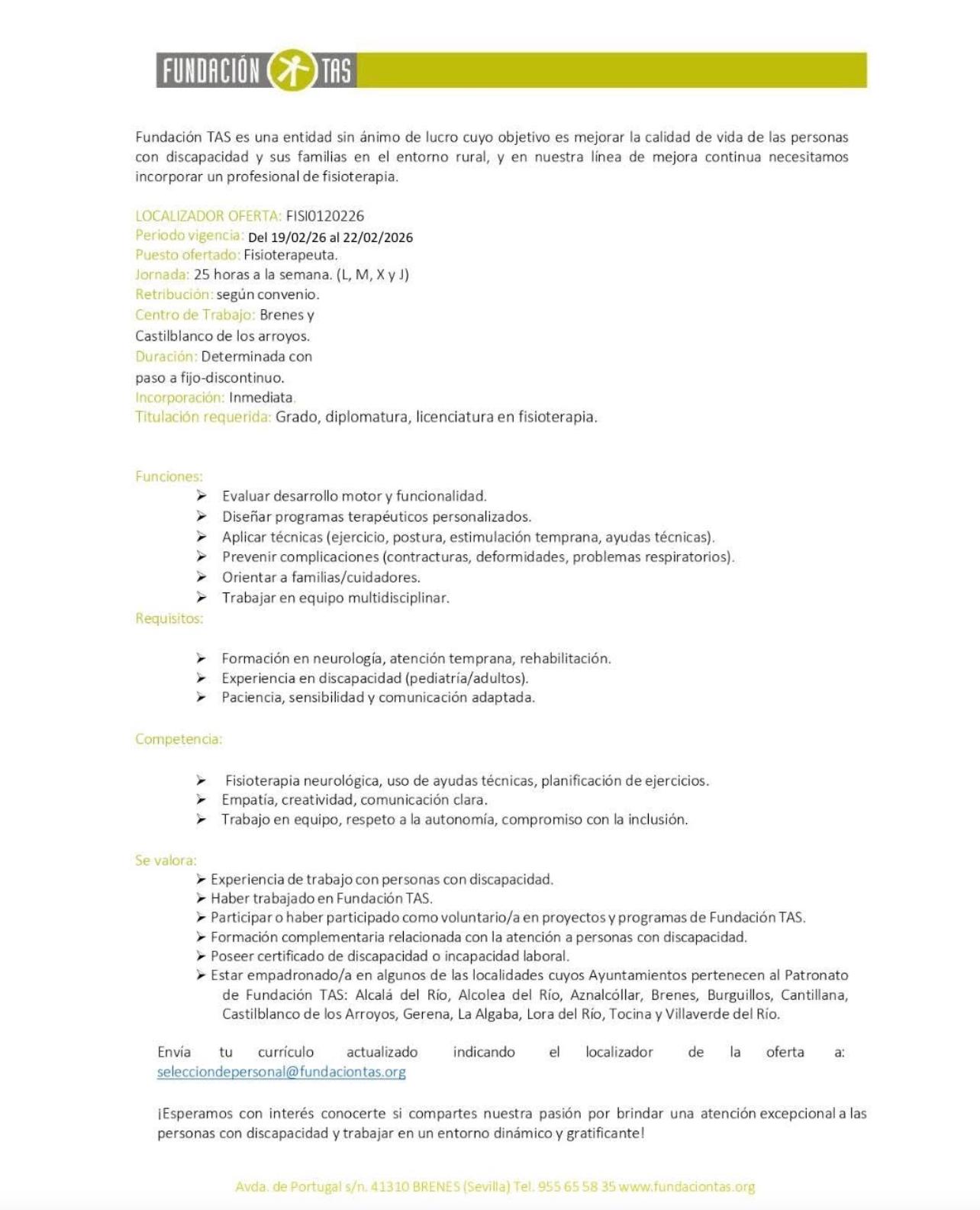 Fundación TAS busca fisioterapeuta para el Centro de Castilblanco