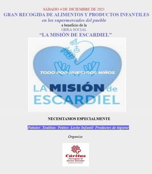 Este sábado 4 de diciembre, parte del equipo de Cáritas Parroquial estará en los supermercados de nuestro pueblo con motivo de la campaña de recogida de alimentos y productos de higiene infantil destinados a la Obra Social "La Misión de Escardiel", entidad que, a través de Cáritas, cubre las necesidades básicas de muchos niños pertenecientes a familias castilblanqueñas en riesgo de exclusión social.
