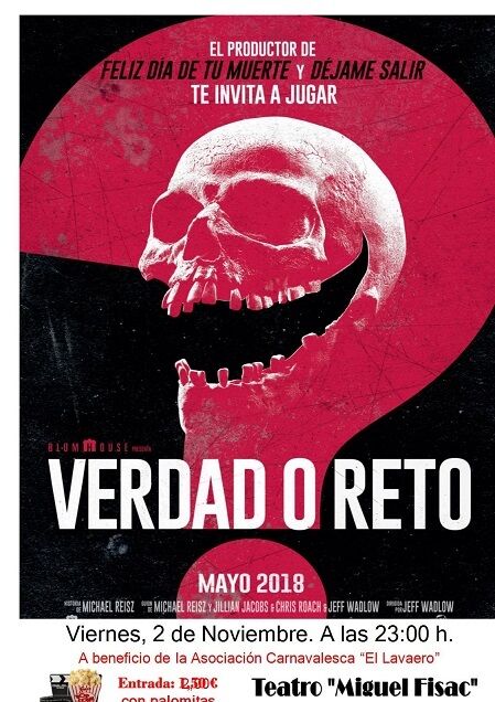 Con motivo del 1 de noviembre, la Asociación de Peñas Carnavalescas ha organizado un ciclo de cine de miedo. Tras las proyecciones en la tarde del miércoles de la película infantil Hotel Transylvania 2 e Insidious la llave perdida, a la que le siguió el jueves por la tarde Monstruos contra Alienígenas, la noche de este viernes estará dedicada a Verdad o Reto.