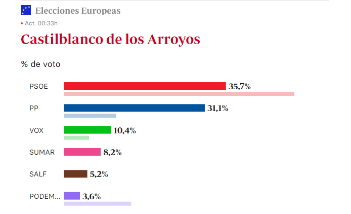 En relación al reparto de votos, en Castilblanco el PSOE ha vuelto a convertirse en el partido más votado con 530 votos, seguido del PP con 461 votos, Vox con 154, Sumar con 121, SALF con 77 y Podemos con 53.