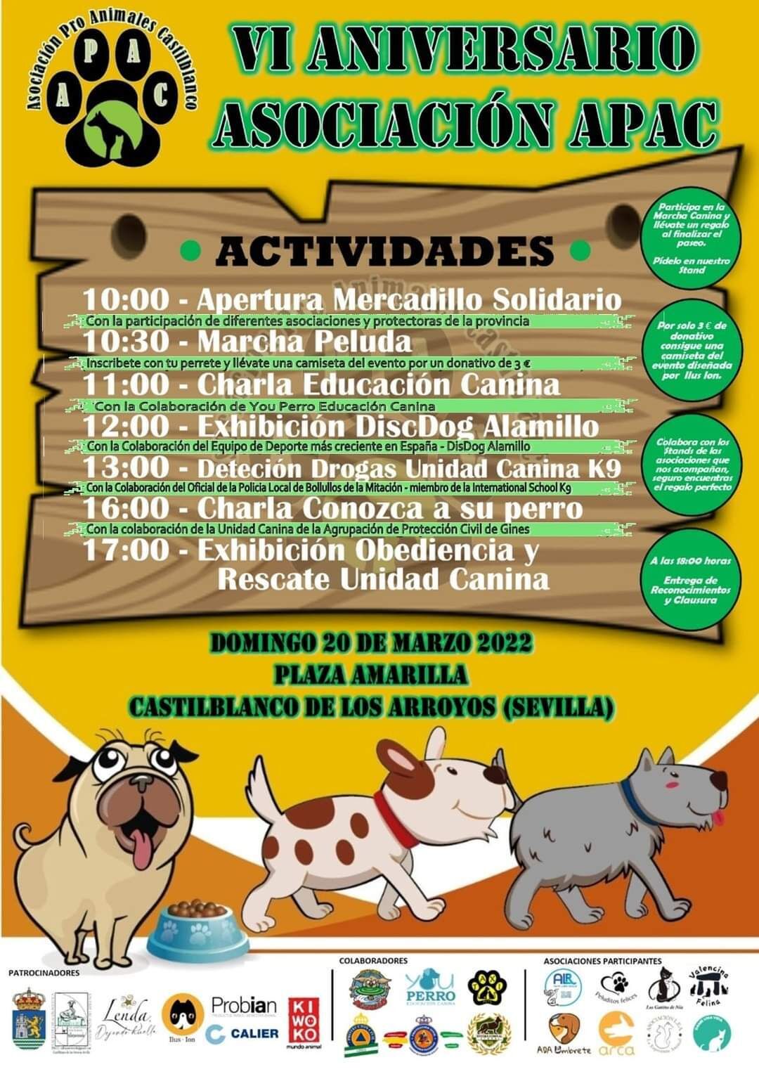 Si eres amante de los animales, este domingo tienes una cita en la Plaza Amarilla. La Asociación APAC celebra su sexto aniversario y lo hace con una jornada de actividades en la que además de un Mercadillo, habrá una Marcha Peluda, una charla sobre educación canina y exhibiciones.