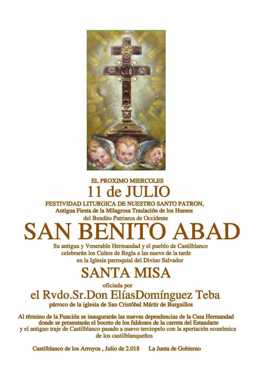 Oficiada por el reverendo D. Elías Domínguez, párroco de la Iglesia de San Cristóbal de Burguillos, al término de la Misa se inaugurarán las nuevas dependencias de la Casa Hermandad, durante la que también se presentará el boceto de los faldones de la carreta del Estandarte y el antiguo traje de San Benito, pasado a nuevo terciopelo, gracias a la aportación económica de los vecinos y vecinas de Castilblanco.