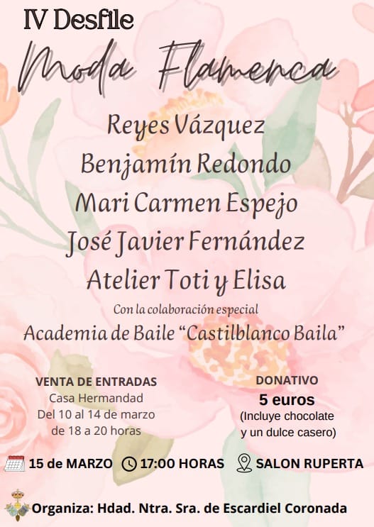 Con el objetivo de recaudar fondos para la nueva Casa Hermandad, la Hermandad de Escardiel organiza lo que será su VI Desfile de Moda Flamenca durante el que podrán ver alguno de los diseños para esta temporada de Reyes Vázquez, Benjamín Redondo, Mari Carmen Espejo, José Javier Fernández y Atelier Toti y Elisa.
