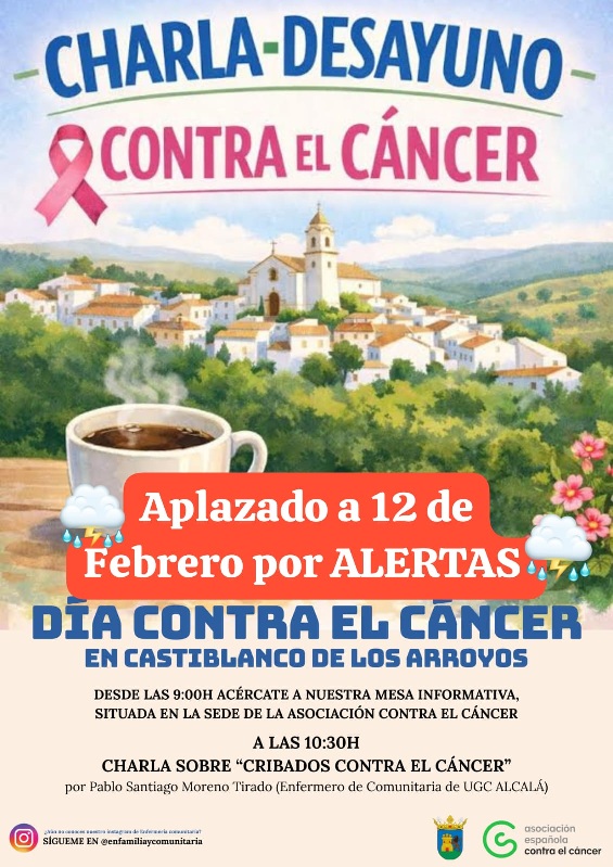La Junta Local de la AECC en Castilblanco informa que la charla-desayuno prevista para el 5 de febrero con motivo del Día Mundial contra el Cáncer se ha pospuesto al jueves 12 de febrero, a las 10:30 horas, en el edificio de los antiguos colegios de la Carretera.