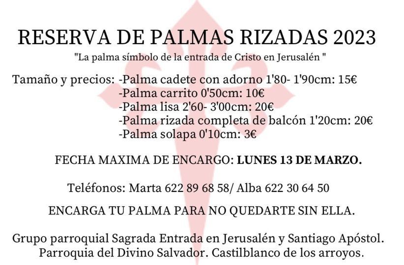 El Grupo Parroquial de la Sagrada Entrada en Jerusalén y Santiago Apóstol informa de que ya pueden realizar sus reservas de palmas para el Domingo de Ramos.
