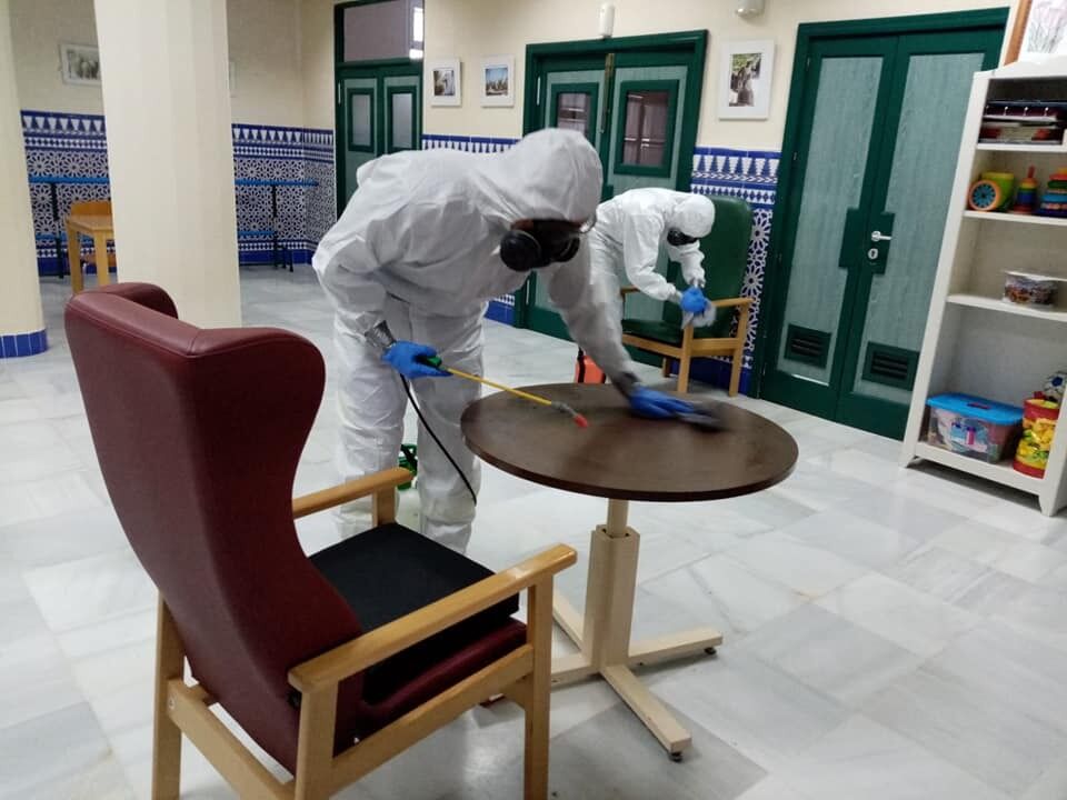 Las tareas de desinfección se han llevado a cabo tanto en el exterior del edificio y las zonas aledañas como en el interior. Mientras para los trabajos del exterior se ha utilizado hipoclorito sódico diluido en agua y en las cantidades recomendadas, para las habitaciones y zonas comunes del interior se ha empleado ozono.