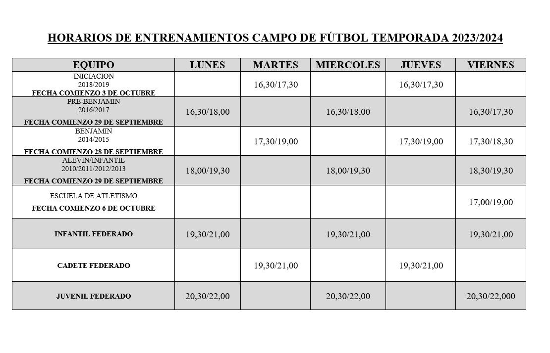También, a lo largo de esta semana y a falta de cerrar oficialmente los grupos, una vez se conozca el número de inscripciones formalizadas, la Concejalía de Deportes ha dado a conocer los horarios provisionales de los entrenamientos, según las distintas modalidades deportivas y categorías.
