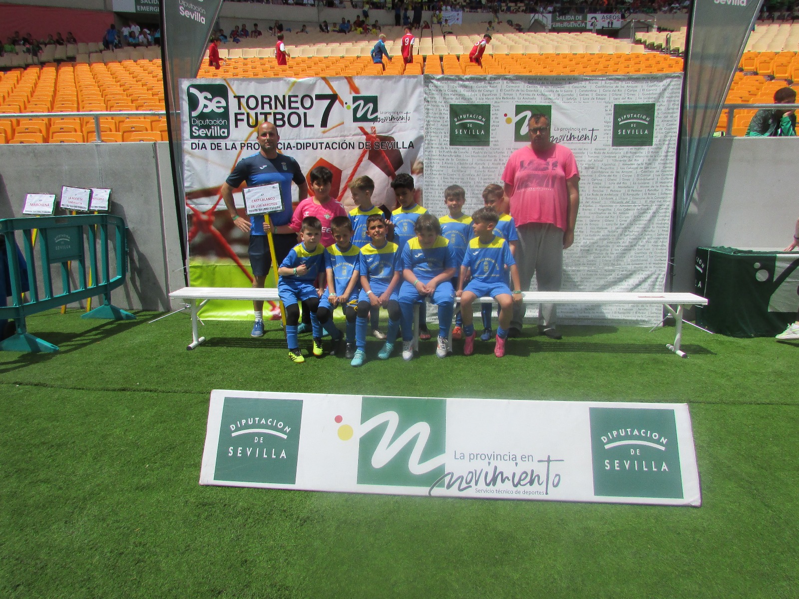 Volvemos a felicitar esta semana a nuestros equipos Prebenjamín y Alevín, pertenecientes a nuestra Escuela Municipal de Fútbol 7 por su participación el pasado sábado en el XXII Torneo de la Provincia de Sevilla que, un año más, concentró a los cuatro mejores equipos de las cuatro zonas en las que se divide la provincia en un escenario muy especial: el Estadio Olímpico de Sevilla.