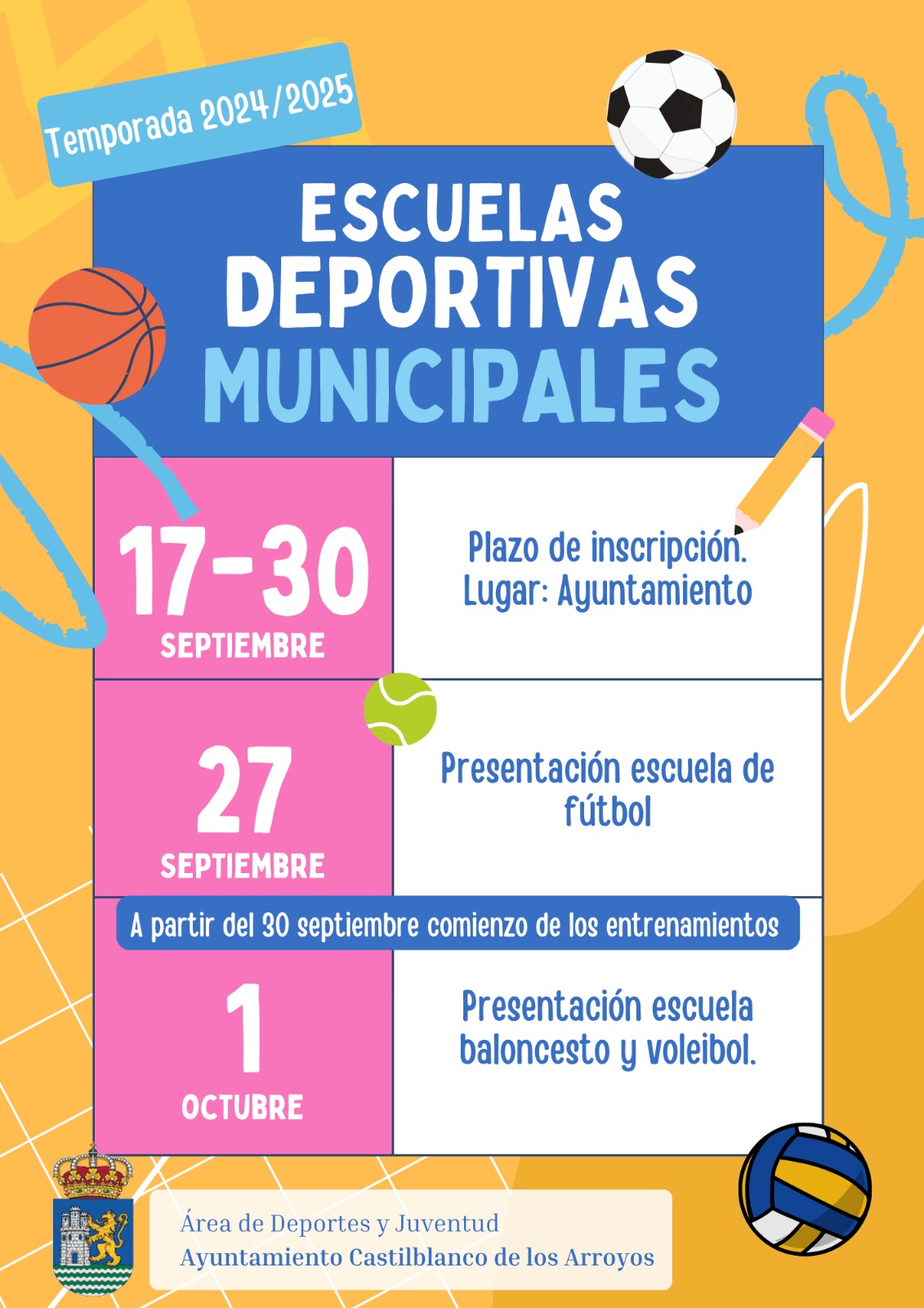 Presentación de todas las categorías: 27 de septiembre a las 18:00 horas en el Ayuntamiento para el Fútbol y el día 1 de octubre a la misma hora para los de Baloncesto y Voleibol.