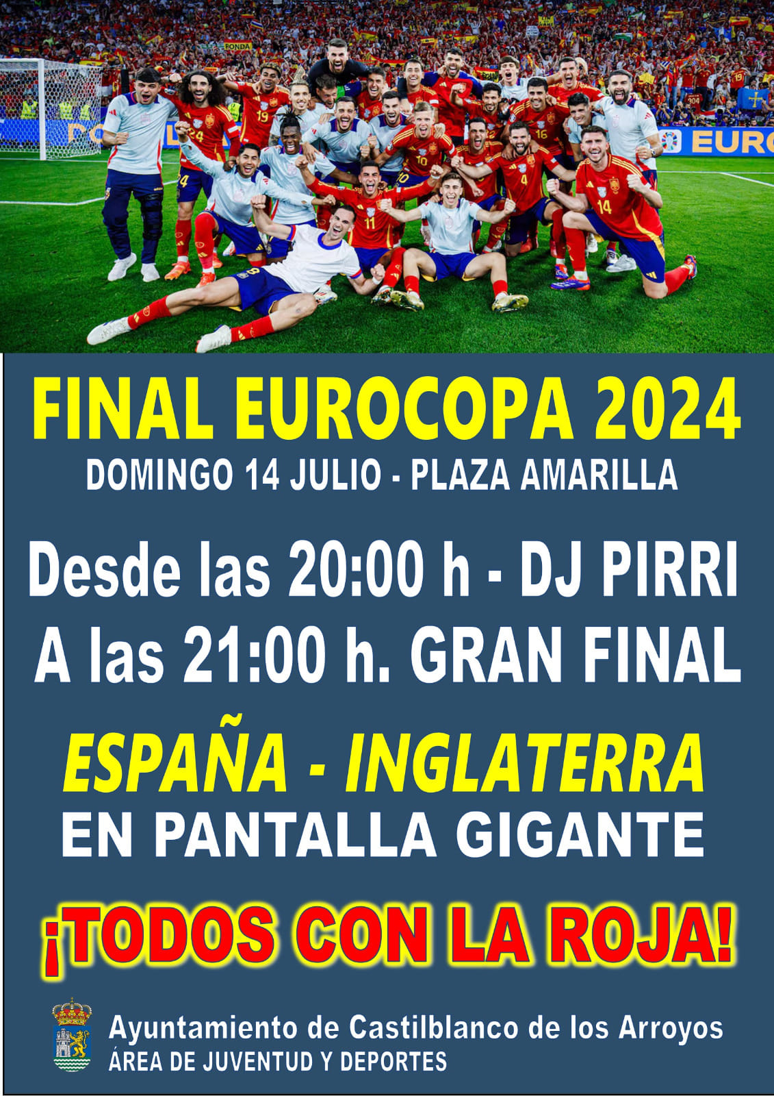 Desde aquí hacemos un llamamiento a todos los vecinos y vecinas para que se sumen a esta cita histórica del fútbol español, en la que la Selección se jugará su cuarto título como Campeones de Europa.