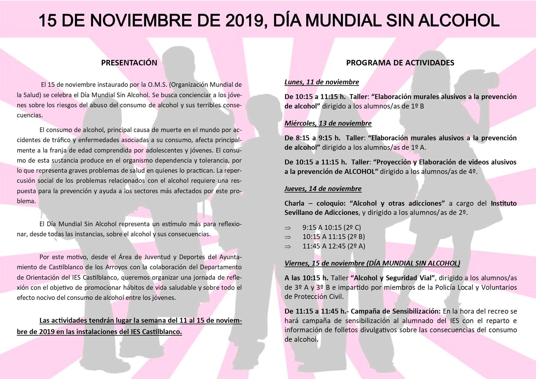Distintas actividades con las que Castilblanco conmemora el 15 de noviembre, Día Sin Alcohol y con las que ante todo se busca concienciar a la población y principalmente a los adolescentes, ha comentado el Concejal de Juventud, Alejandro Romero, “pues no debemos olvidar que el consumo de alcohol se ha convertido en un problema social del que al final de un modo u otro, todos acabamos siendo víctimas. Agradecemos el trabajo y labor de la Asociación Nueva Vida así como de aquellas entidades que colaboran con esta campaña y que tan necesarias son, consiguiendo llegar a aquellas personas que necesitan sensibilización y tratamiento para lograr su desintoxicación e integración en la sociedad”.