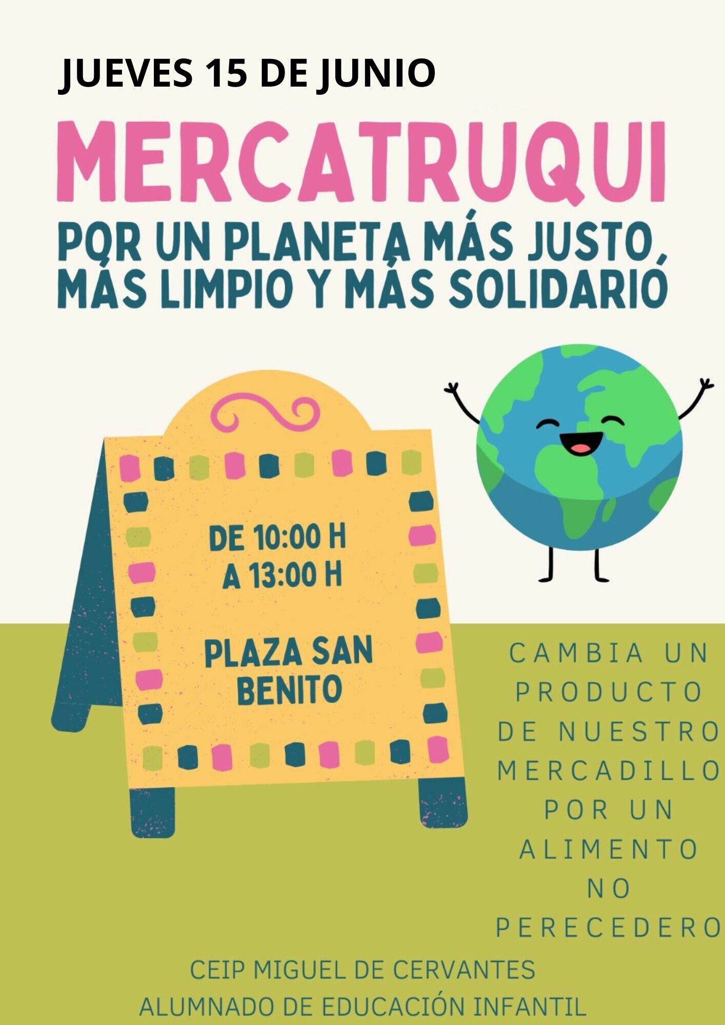 Debido a las precipitaciones registradas en la mañana de este jueves, el Mercadillo Solidario organizado por el alumnado de Infantil y sus familiares tendrá lugar el próximo jueves 15 de junio.