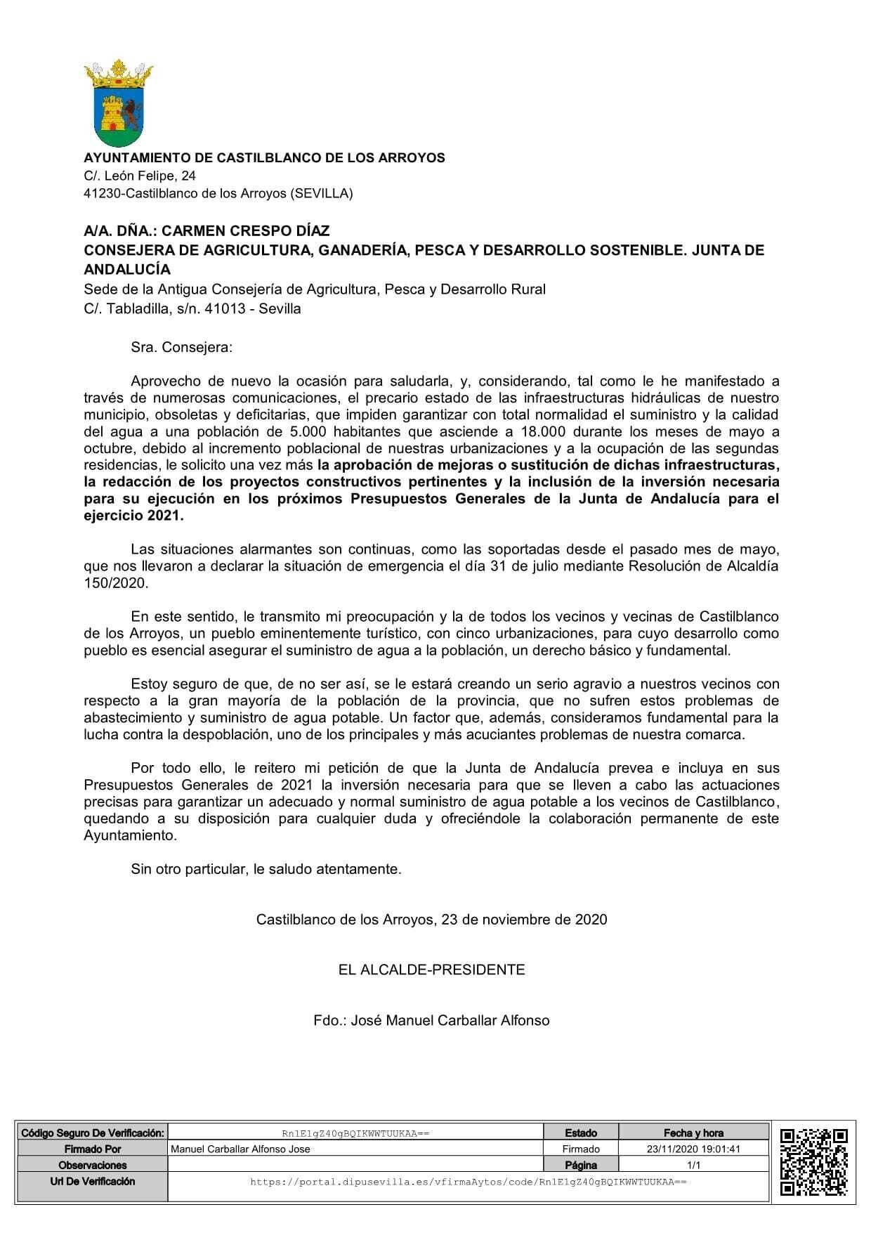 Tal como el Alcalde ha venido demandando a lo largo de todo el año, a finales del mes de noviembre ha enviado dos nuevas comunicaciones, en esta ocasión a la Consejería de Agricultura, Ganadería, Pesca y Desarrollo Sostenible, así como a la Consejería de Fomento, Infraestructuras y Ordinación del Territorio, para que se incluyan en los presupuestos generales de la Junta de Andalucía de 2021 el arreglo integral de la carretera Castilblanco-Burguillos y la mejora de la red de Castilblanco a El Pedroso, así como la sustitución de las infraestructuras hidráulicas.