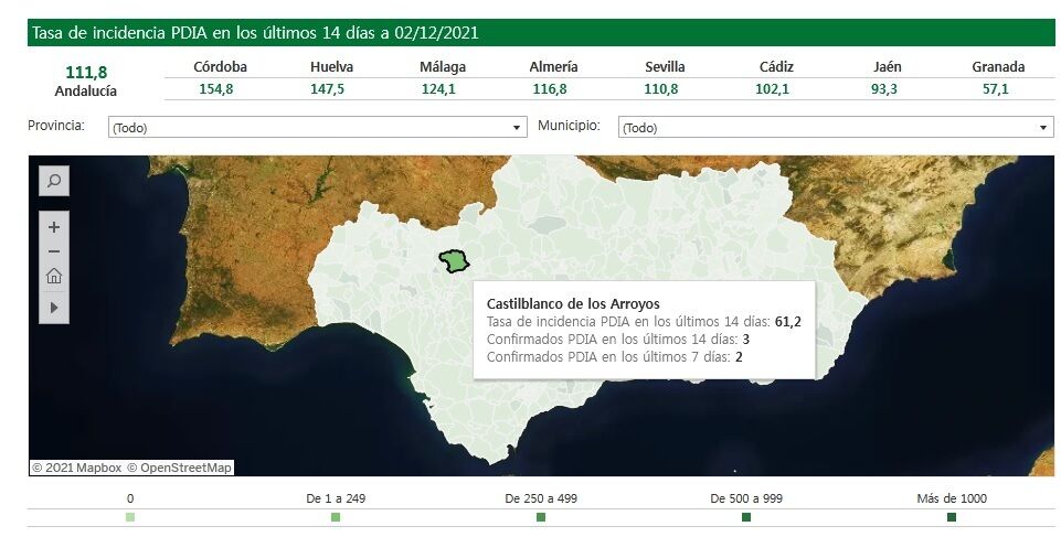 Según el último informe de la Consejería de Salud y Familias publicado en el día de hoy, ascienden a 3 los positivos por Covid-19 en la localidad. La tasa de incidencia acumulada a 14 días se sitúa en 61 casos por cada 100.000 habitantes, Sevilla 110, Andalucía 111.