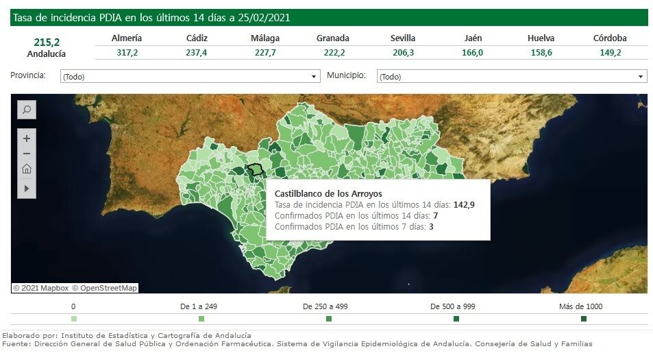 Según los datos publicados por la Consejería de Salud y Familias, el número de personas afectadas por COVID-19 se mantiene con respecto al pasado viernes, con un total de 7 casos diagnosticados en los últimos 14 días, 3 de ellos en la última semana. La tasa de incidencia se sitúa en 142 casos por cada 100.000 habitantes (Sevilla 206, Andalucía 215).