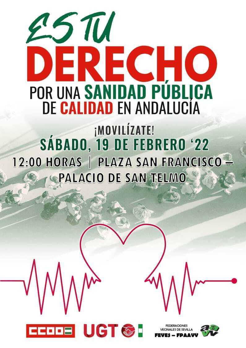 Tras otras concentraciones celebradas durante las pasadas semanas, en las que los responsables políticos pertenecientes a 90 municipios de la provincia de Sevilla se unieron para exigir al Presidente de la Junta de Andalucía la recuperación de una sanidad pública de calidad, este sábado se ha convocado una gran manifestación apoyada por las distintas organizaciones sociales y sindicales, a la que el Alcalde ha pedido que se sumen todos los vecinos.