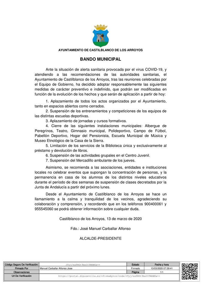 Desde el Ayuntamiento de Castilblanco de los Arroyos, siguiendo las instrucciones señaladas por el Ministerio de Sanidad y atendiendo los acuerdos adoptados por la Junta de Andalucía, se ha ordenado poner en marcha diferentes medidas de prevención y control ante la alerta sanitaria provocada por el virus COVID-19.