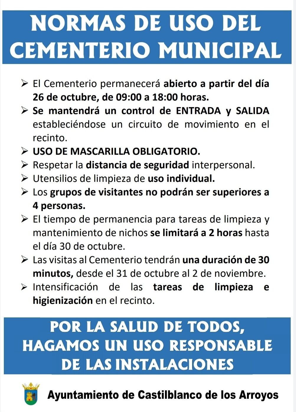 El horario de visitas será de 9:00 a 18:00 horas, siendo obligatorio el uso de mascarillas. En todo momento se deberá respetar la distancia de seguridad interpersonal y el uso de los utensilios de limpieza deberá ser individual.