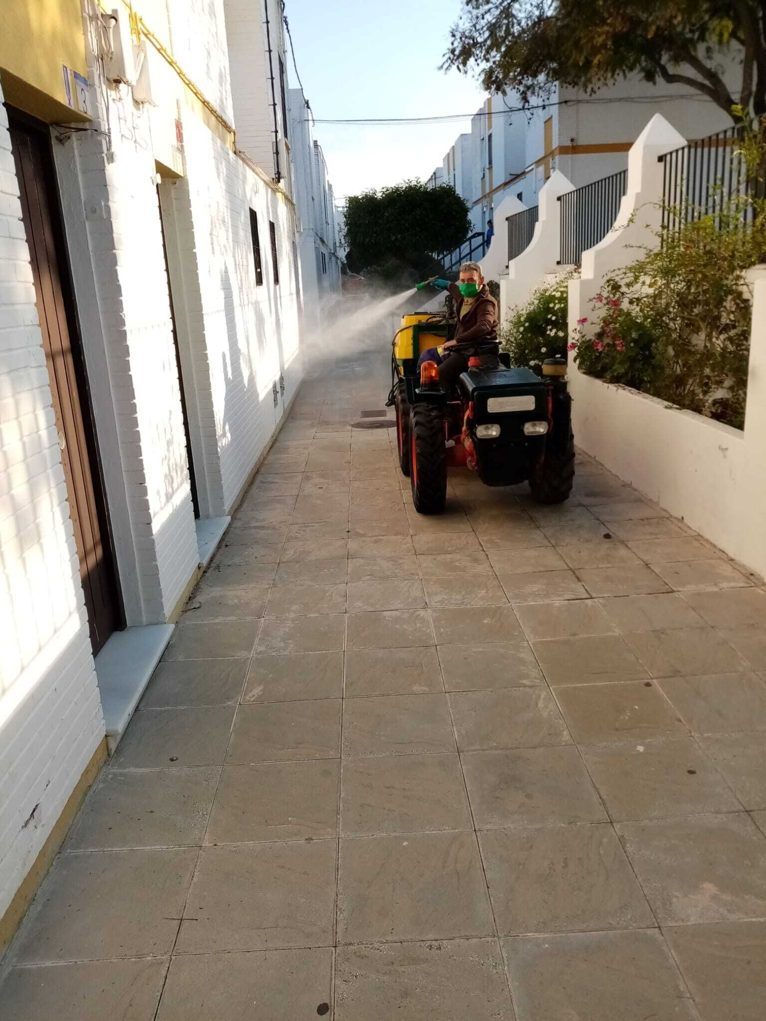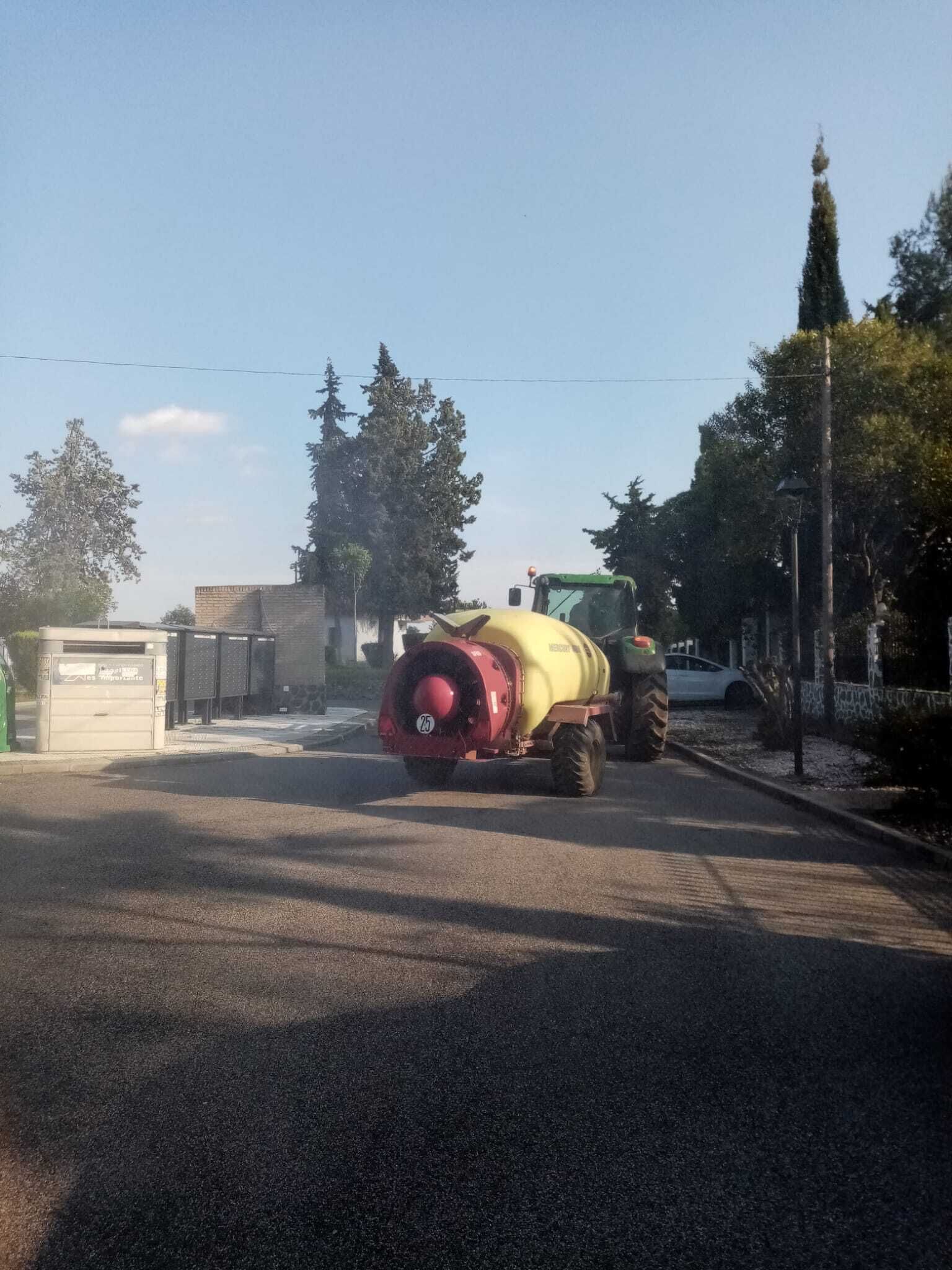 Se intensifican las tareas de desinfección del viario. Por cuarta vez, el Ayuntamiento ha coordinado en el día de hoy un nuevo plan de desinfección, gracias a la colaboración de varias fincas y tractoristas locales.