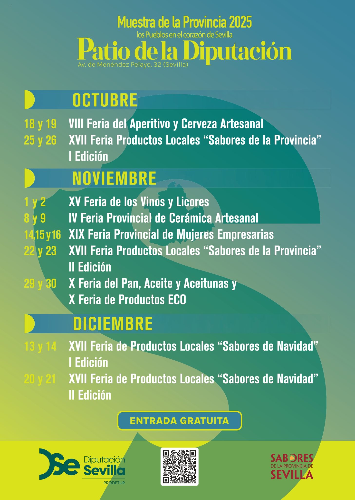 La Diputación de Sevilla ha publicado el calendario de Ferias de la Muestra de la Provincia 2025, que se celebrarán entre los meses de octubre y diciembre en el Patio de la Diputación.